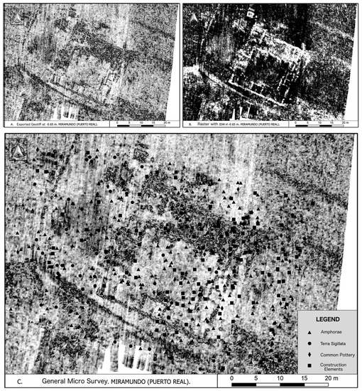 - Lagóstena, L.; Ruiz Gil, J.A.; Martín Mochales, D.; Pérez Marrero, J.; Rondán-Sevilla, I.; Trapero Fernández, P.; Catalán González, F.J.; Ruiz Barroso, M. El establecimiento rústico alto-imperial de Miramundo (Puerto Real, Cádiz). Un caso de estudio mediante combinación de técnicas de investigación no invasivas. In Estudos Arqueológicos de Oeiras 29; Câmara Municipal: Oeiras, Portugal, 2021; pp. 57–64. [Google Scholar]