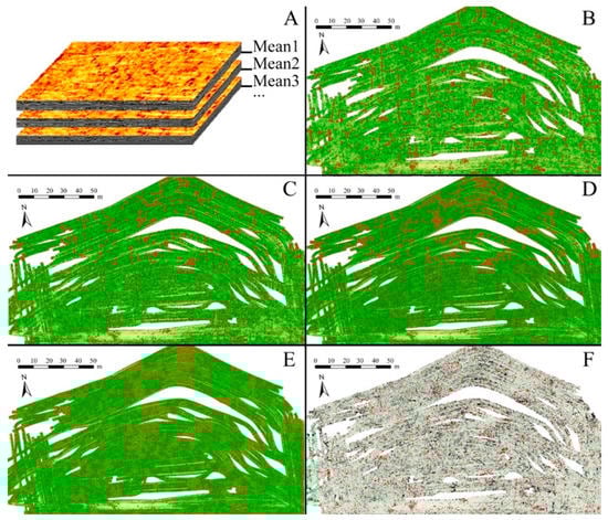 Example of a stratigraphic layouts study of urban phases in the case of the Phoenician-Punic settlement of Castillo de Doña Blanca (El Puerto de Santa María, Cádiz). (A) shows the multi-layered recording with GPR based on depths. (B–F) show different depth ranges with their own characteristics in the urban layout. Source Unidad de Geodetección. UCA.