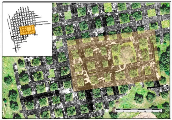 Other circumstances hindering traditional archaeological analysis are related to topographical conditions or current land uses. The former often conceal the original foundations of ancient cities and their adaptation to the physical environment, which in specific geographical contexts do not respond to pre-established canons. Concerning the latter, when, for example, we find ourselves in former tree plantations (fruit orchards, olive groves, vineyards), the development of archaeological activities interferes with the local economy and presents many problems in terms of research logistics. As in previous cases, our experience in the study of settlements with these geographical and productive conditions [] confirms the improvement in obtaining historical information using GPR combined with other current techniques (LiDAR, Magnetometry) (Figure 14).