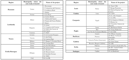 | 1 | The selected cases respond to a twofold analysis: the presence of a civic actor (in line with the features discussed by XXX [11]) and its activities in a former unused public building. The selected cases are based on different dynamics that are significant and valuable to report. The selected cases are located in different Italian regions (namely, Piemonte, Lombardia, Veneto, Emilia Romagna, Toscana, Lazio, Umbria, Campania, Puglia, Basilicata, Calabria, Sicilia and Sardegna). They provide an overview of examples, dynamics and kinds of activities. Although the list is not exhaustive, it encompasses a variety of cases that contributes to a general understanding of the phenomenon. |