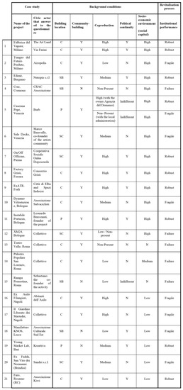 To sum up, the background conditions are an important element that contributes to understanding the institutional performances, also considering aspects that might negatively impact a revitalisation process. This might depend, for example, on the location of the building, the low degree of co-production, a discontinued political interface, the lack of contextual conditions or the inadequacy of the civic actor to promote itself. Their absence increases the likelihood of failure, as well as their presence is crucial for the revitalisation processes. These conditions can serve as a checklist to guide and improve civic actors’ institutional performances. By continuously working towards meeting these conditions, civic actors can enhance their effectiveness and increase the chance of achieving a successful revitalisation outcome (Table 1).