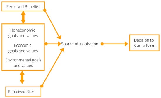 We anticipated three primary relationships occurring in our model. First, we posited that new and beginning farmers had developed specific noneconomic, economic, and environmental goals as a product of experience. Second, we expected that a person’s goals and values contribute to a comprehensive set of goals and values that they subsequently weigh against what they believe are the risks and benefits of starting a farm. Finally, we hypothesized that while this complex weighting of pros, cons, values, and goals occurs, the person experiences or encounters some sources of inspiration that facilitate the decision to start a farm.