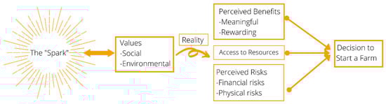 “Reality” in Figure 2 was the facilitator between a potential farmer’s inspiration, values, and ideals and the risks, resources, and benefits of making starting a farm a reality. Proposition 3 states, “Inspiration and values are often rooted in idealism,” Proposition 4 holds that “idealistic farmers confront the reality of starting a business through perceived benefits, access to resources, and perceived risks”. The following sections address this facilitation.