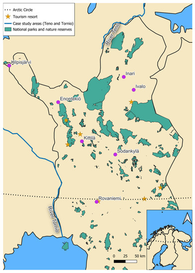 The study area encompasses two internationally recognised salmon fishing rivers. The first, Teno, runs along Finland’s northern border with Norway, and the second one, Tornio, forms part of the border between Sweden and Finland (Figure 1). Both watersheds are located in the Finnish Sámi homeland as well. Teno is one of northern Europe’s most productive wild salmon rivers and attracted the most tourists for recreational wild salmon fishing before the fishing restrictions were implemented [37]. The Tornio River is among the largest rivers in northern Fennoscandia [38] (p. 297).