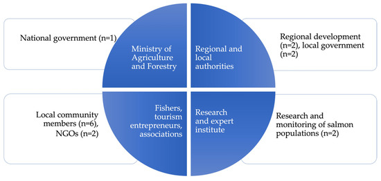 Figure 2. Types of stakeholders participating in the interviews (n = 15). There were seven interviewees from Teno and six from Tornio. Two governmental administrative representatives provided their views of both rivers.