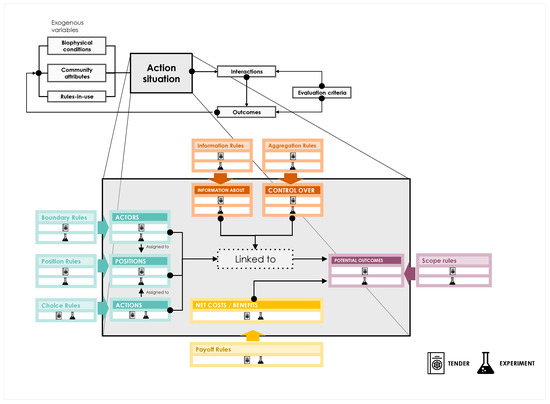 The Institutional Analysis and Development framework (background) and the structure of analysis of an action situation (foreground) [61].