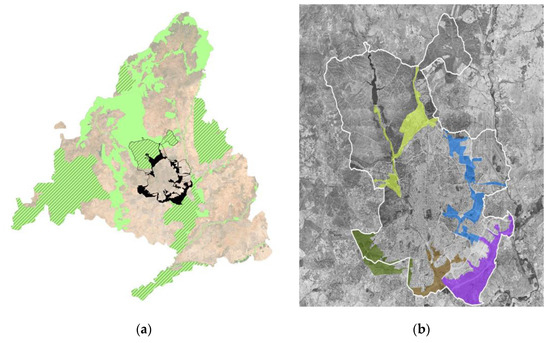 (a) Map of the metropolitan forest within the administrative boundary of the province of Madrid, where in green are marked the areas of protection of animal and plant species. Source: https://lab.elmundo.es/bosque-metropolitano-madrid/index.html (accessed on 10 January 2023); (b) Map of the metropolitan forest in the city of Madrid (the different colors indicate the lots into which the project is divided). Source: Madrid City Council website: https://estrategiaurbana.madrid.es/concurso-bosque-metropolitano/ (accessed on 10 January 2023).