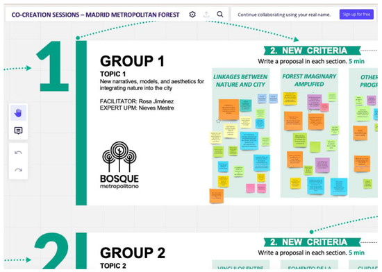The objective of these sessions was to co-create a collective vision of the future forest and establish design criteria for consortia of companies intending to submit proposals. On the first day (13 July 2020), a variety of narratives were presented to provide context for the Metropolitan Forest project within the history and morphology of the city of Madrid. On the second day (14 July 2020), participatory ideation was conducted to expand the imaginaries of the future forest beyond a purely techno-environmental vision. Figure 4 displays the resulting digital workboard. The criteria ideation was structured around three topics: (i) New narratives, models, and aesthetics for integrating nature into the city; (ii) nature as a protector of health and biodiversity; and (iii) new green economies and green jobs.