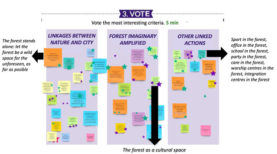 Zoom-in view of the voting stage on the workboard, using stars, focusing specifically on the topic: “New narratives, models, and aesthetics regarding the introduction of nature in the city”. Three suggestions from three participants are translated into English in the margins of the figure. (14 July 2020). Source: Universidad Politécnica de Madrid.