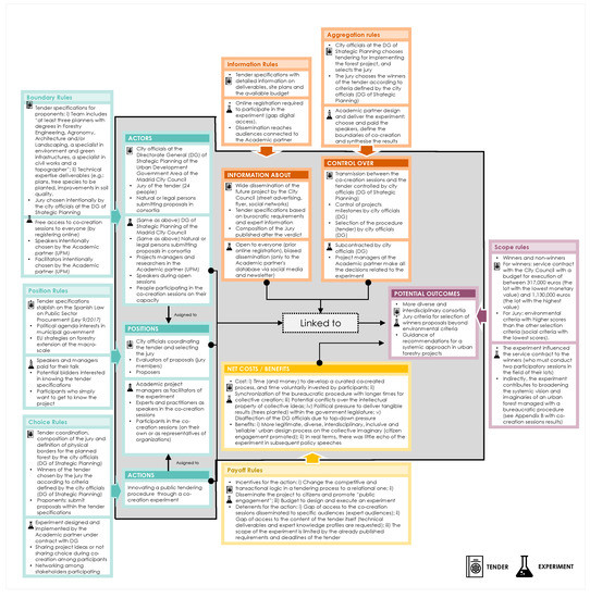 The results of applying the IAD conceptual framework to the case study are presented below. Figure 6 summarizes the analysis of the action situation [62]. For the purposes of this research, this refers to the public tender process (the tender) with the previous co-creation sessions (the experiment) as the procedures chosen to define the initial phases of design and management of the Madrid Metropolitan Forest project. In the Metropolitan Forest case, the action situation was regarded as shaping the efforts toward accessible and interdisciplinary forest design and management.