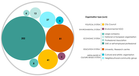 Related to the first potential outcome, the IAD approach reveals that the experiment allowed the broadening of the profile of audiences and scope to co-create. Figure 7 classifies the profiles of the 738 participants registered, following the approach of the Quintuple Helix Innovation Model [79,80]. Here, it can be observed that almost half of the participant organizations were small and medium-sized enterprises (SMEs) and self-employed professionals, accounting for 47% of the participants. In total, 12% of participants could be described as “non-regular” actors in a public tender, such as associations, students, representatives of cultural centers, and environmental NGOs. It was observed that this incipient diversity was not maintained in the subsequent phases of the tendering process because the 33 proposals received by the Madrid City Council by the deadline 2.5 months later [78] were composed by engineering companies and architectural firms leading each consortium—and only one winning proposal incorporated an actor with experience in participatory processes who was knowledgeable about the historical activist movement in the district.