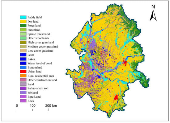 As one of the three significant plains in Northeast China, Songnen Plain is located between the Great Khingan Mountains, Lesser Khingan Mountains, Changbai Mountains and Songliao River basins. It is formed by alluvial deposits of the Songhua and Nenjiang Rivers. The geographical coordinates are 121°38′~128°33′ E and 42°49′~49°12′ N (Figure 1). It covers the western part of Heilongjiang Province (Harbin, Qiqihar, Daqing, Heihe and Suihua) and the northwestern part of Jilin Province (Changchun, Siping, Songyuan and Baicheng), with a total area of 225,000 km2. Belonging to the temperate monsoon climate, the average annual precipitation is approximately 406–689 mm, with an uneven spatiotemporal distribution, gradually decreasing from east to west. The evaporation from May to September is approximately 446–732 mm, which is much more than the precipitation, so it is prone to drought disasters. Affected by climate, the soil in Songnen Plain is diverse and fertile. The western part is the agro-pasture ecotone, whereas the central and eastern parts are typical agricultural cultivation areas, forming an important national key commodity grain base in China.