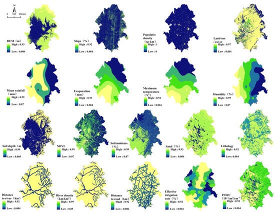 Among the 18 factors selected in this study, the higher the positive index value, the higher the drought risk, and the Fuzzy-LARGE membership function was used in this situation. These positive indicators included elevation, slope, LULC, mean maximum temperature, mean evaporation, sand content, lithology, distance to river and distance to roads. In contrast, the lower the negative index value, the higher the drought risk, and the Fuzzy-SMALL membership function was applied in this case. The negative indicators were average annual rainfall, mean humidity, NDVI, soil depth, soil moisture, river density, irrigation index and PAWC. The Fuzzy-LINEAR function was used for population density [53]. The details are shown in Table 2.