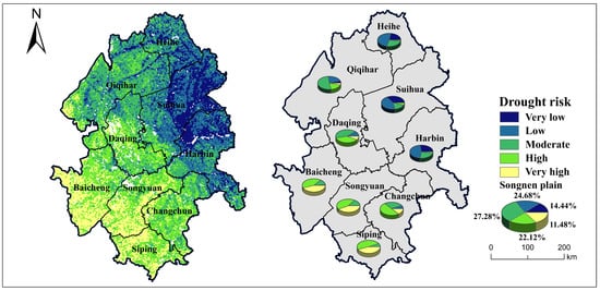 The drought risk level of Songnen Plain decreased gradually from southwest to northeast, and the proportion from high to low was moderate risk (27.28%) > high risk (24.68%) > low risk (22.12%) > very low risk (14.44%) > very high risk (11.48%). The area of very high risk was 32,491.01 km2, and was mainly distributed in Siping, Baicheng and Songyuan, accounting for 48.24%, 45.29% and 42.65% of the city risk level, with a small distribution in Longjiang County and Dulbert Mongolian Autonomous County. The high risk and moderate risk crossed over from south to north, higher in the south, with a very high risk and high risk proportion of more than 85%. The high level proportion in these southern cities was 49.89%, 45.10% and 42.92% for Changchun, Siping and Songyuan, respectively. These regions with very high and high ADR should be paid more attention to. The northern region was integrated with low risk and moderate risk, but the moderate risk accounted for a large proportion. It concentrated in Qiqihar (51.33%), Daqing (42.77%) and Changchun (31.50%), where the drought risk cannot be ignored. The very-low-risk area was 25,819.67 km2, and was mainly concentrated in the Heihe, Harbin and Suihua areas, which are the main dry grain production areas of Heilongjiang Province.