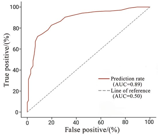 The prediction rate curve is shown in Figure 7. The AUC value of the risk model was 0.886, and the prediction rate was 88.6%. The closer the AUC value is to 1, the more accurate the model is. Therefore, the prediction accuracy of the model in this paper met the research needs.