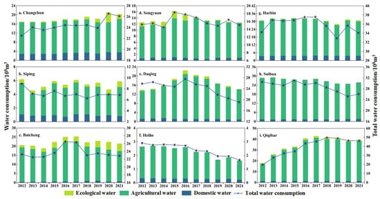 Figure 9. Main water uses and the total volume of water consumption in Songnen Plain.