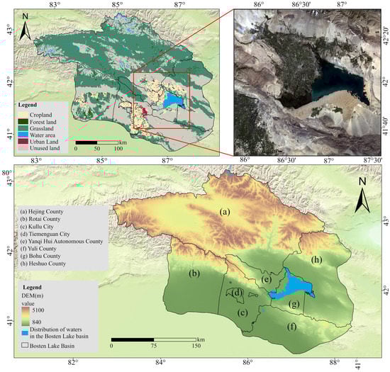 In this paper, the BLB was selected as the study area (Figure 1), which is located in the south of the Tianshan Mountains in Bayingoleng Mongol Autonomous Prefecture, Xinjiang Uygur Autonomous Region, northwestern China, between 82°57′ and 88°18′ E and 41°25′ and 43°34′ N, with a watershed area of about 79,204.25 km2. The topography of this region is high in the north and low in the south and high in the west and low in the east, with mountains, canyons, and basins crisscrossing the area, and the terrain is extremely complex. Bosten Lake is the largest inland freshwater lake in China and the origin of the Peacock River []. The whole area of the BLB includes Heshuo County, Hejing County, Yanqi County, Bohu County, Luntai County (part of it), Kulle City, Tiemenguan City (formerly the Second Division of Xinjiang Production and Construction Corps), and part of Yuli County. The Bosten Lake basin has a temperate continental arid climate. The average annual temperature ranges between 8.2 and 11.5 °C and the average annual precipitation is only about 60 mm, while the evaporation is higher than 2000 mm. The water bodies of Bosten Lake are strongly influenced by surface temperature and anthropogenic factors, so the study of surface temperature in the BLB has important theoretical significance and practical value for the sustainable socio-economic development of the basin and even the healthy development of the Tarim River ecosystem.