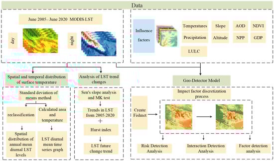 The framework of this study is shown in Figure 2. The diurnal LST data is used to classify the levels, analyze LST and its future trends from 2005 to 2020, and finally analyze the influencing factors of surface temperature change.