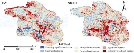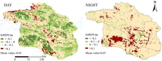 To better analyze the trends of LST and future trends, this study superimposed the results of Sen’s slope analysis, the Mann Kendal trend test, and the Hurst index to analyze and classify the rank of trends. The specific division conditions are given in Table 4.