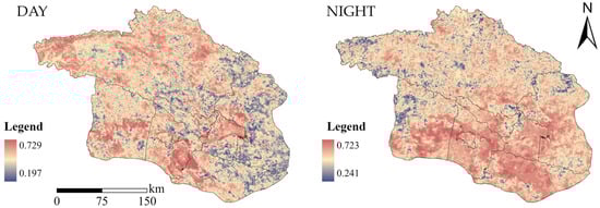 In the results of the Hurst index (Figure 7), during the daytime, 63.86% of the areas in the BLB have a continuous future LST trend (Hurst > 0.5), which indicates that the future trend is most likely to be the same as the present one, and another 36.12% of the areas have an unknown future surface temperature trend (Hurst ≤ 0.5). At night, 80.24% of the regional LST trends are persistent in the future (Hurst > 0.5), and 19.76% of the regional LST future trends are unknown (Hurst ≤ 0.5).