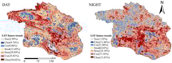 At night, the future trend of LST is 56.33% in continuously increasing areas, mainly in Kulle City, Heshuo County, Yanqi Hui Autonomous County, Yuli County, and the eastern fringe of Luntai County, and 42.15% in the area continuously decreasing areas, which are mainly scattered around Bosten Lake, the southern fringe of the study area, and a great part of Hejing County. In general, the area of the region where LST continues to rise in the future is larger in both daytime and nighttime, and LST in these regions will maintain a continuously rising trend in the future.
