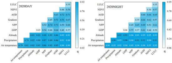To investigate the influence of different factors on the diurnal land surface temperature variation in the BLB, 10 detection factors were selected for analysis, the explanatory power q-values of single-factor effects were obtained (Table 5), and the explanatory power of each factor for daytime LST variation was ranked in following order: altitude (0.806) > air temperature (0.793) > precipitation (0.787) > AOD (0.631) > NPP (0.519) > gradient (0.450) > NDVI (0.445) > LULC (0.345) >GDP (0.034). The ranking of the explanatory power of each factor of nighttime LST variation was air temperature (0.936) > altitude (0.917) > precipitation (0.897) > AOD (0.603) > NPP (0.487) > NDVI (0.357) > LULC (0.354) > gradient (0.346) > GDP (0.062), and all factors have p-values less than 0.01, indicating that the explanatory power of all factors is significant. Regardless of day and night, the q-values of elevation and precipitation are greater than 0.3, which are the dominant environmental factors of LST variation in the Bosten Lake basin, while the q-values of GDP are less than 0.3 and have relatively less explanatory power for LST variation in the Bosten Lake basin, thus indicating that natural factors mainly influence LST variation in the BLB.