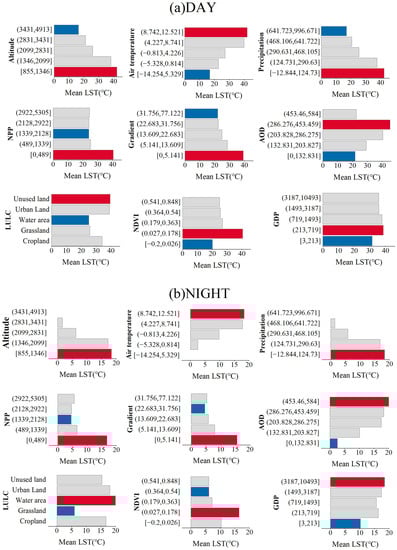 The risk interval or category of each influencing factor in the daytime and nighttime. Note: red indicates the highest average LST in the interval and blue indicates the lowest.