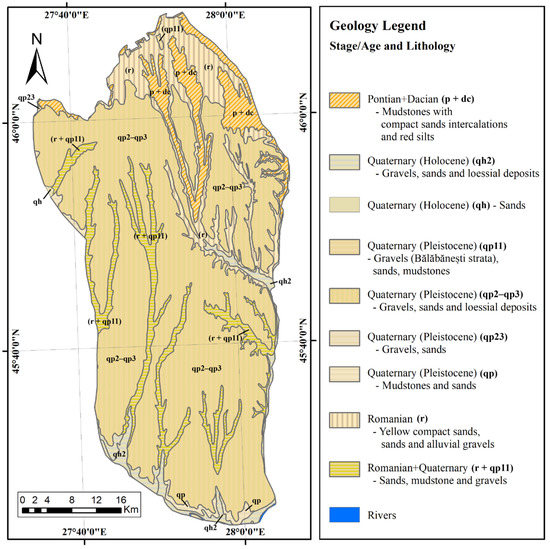 The lithology of the Covurlui Plateau is characterized by an alternation of sands with mudstones, loess-like deposits, and Quaternary gravels [42]. These deposits belong to the Pontian, Dacian, and Romanian layers, specific to the Middle and Upper Pliocene period (Figure 2). During the Pontian period, the region experienced a pronounced marine regression [43], which facilitated the deposition of a series of mudstone and compact sand with a thickness of 50–70 m, over which Dacian deposits occur with the presence of red silts in a 2–10 m thick layer. Above the Dacian, a series of Romanian deposits consisting of a succession of yellow sands with mudstones, gravels, and sands having 30–50 m in thickness occur, being finally covered by a consistent layer of a maximum of 60 m of loess. As a result of the neotectonic uplift during the Romanian orogenetic phase that affected the whole Moldavian Plateau, the layers are slightly dipping from northwest to southeast. Thus, the oldest Pontian-Dacian and Romanian series are found on the slopes within the northern third of the region, while the younger Quaternary loess typifies the extensive interfluvial ridges, especially in the central and southern parts of the region [44,45].