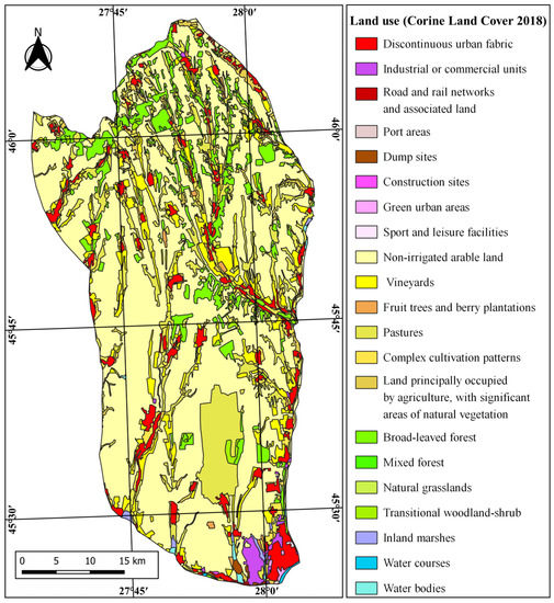 Nowadays, the Covurlui Plateau is one of the important agricultural areas in Romania [48]. According to the Land Cover dataset provided by the Copernicus Land Monitoring Service, over 83% of the total area of the region is occupied by agricultural fields, 57% being arable land [49] (Figure 3).