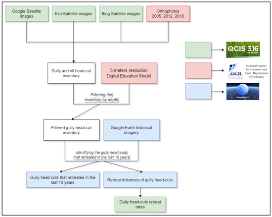 The first methodology was used to identify gully head-cuts, filter rills, and identify gully head-cuts that have retreated in the last decade. To accomplish this task, a variety of data sources were used, including Google Satellite imagery, Bing Satellite imagery, Esri Satellite imagery, aerial photos from 2005, 2012, and 2016, and Google Earth historical imagery (Figure 5). These data sources were analyzed using various software, including QGIS 3.16 with the Quick Map Services plugin, the National Agency for Cadastre and Land Registration (NACLR) geoportal (https://geoportal.ancpi.ro/accessed on 30 October 2022), and Google Earth Pro time series. These materials were used to create an inventory of gullies and rills. To filter the results and create a database of gully head-cuts, a 5-m resolution Digital Terrain Model provided by NACLR was used to analyze the depth and distinguish gullies from rills. After the inventory was filtered, Google Earth historical imagery was employed to create a database of gully head-cuts, identify gully head-cuts that have retreated in the last 10 years (between 2012 and 2022), and quantify the retreat distance for each of them. In addition, supplementary validation for the largest gullies was performed on the most recent set of satellite images, such as Sentinel 2 or even Landsat. Despite the coarse spatial resolution (10 m for Sentinel 2 and 30 m for Landsat), the presence of a relevant number of large gullies could be validated via these spatial datasets.