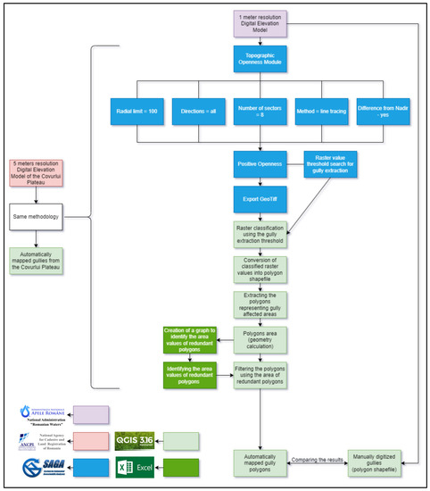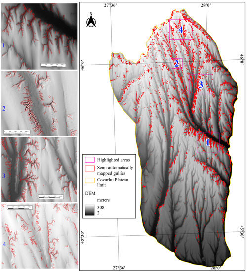 The majority of modern research from the international literature regarding the semi-automated extraction of gullies is based on using a mixture of satellite imagery and machine learning. Although most of this category of research provides significantly relevant and important results in the field, the greatest disadvantage is given by the incapacity to verify if the generated forms of linear erosion can be classified as “gullies”. Despite being viewed as gullies from satellite imagery in the optical spectrum, in fact, they can be classified as rills with low depth values or small river valleys. In the current study, the methodological approach has identified only gullies in the Covurlui Plateau, while river valleys and rills with depth values lower than 1.5 m were not extracted.