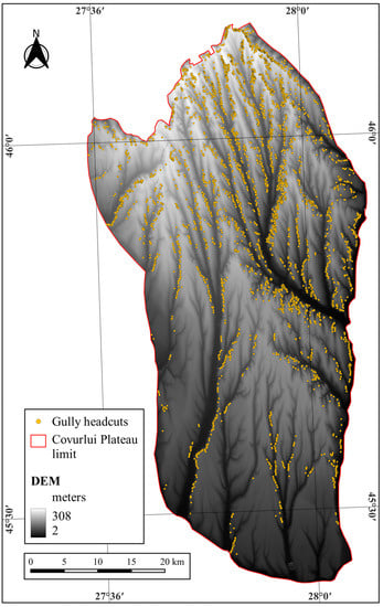 Map of gully head-cuts distribution in the Covurlui Plateau.