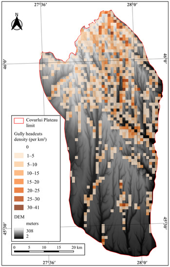 The outcomes obtained by application of the first methodology consist of an inventory of 5868 gully head-cuts within the Covurlui Plateau (Figure 7). The areas with the highest densities of gully head-cuts were generally located in the northern half of the plateau, registering the absolute maximum value of 41 gully head-cuts per square kilometer (Figure 8). Overall, the average density for the entire Covurlui Plateau was estimated at 2.57 gully head-cuts per square kilometer.