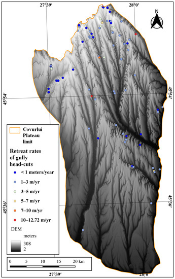 Map of the gully head-cuts retreat in the Covurlui Plateau.