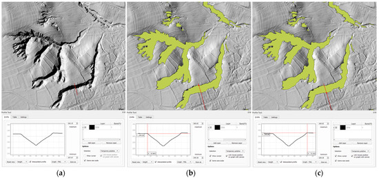 Topographic profile of gullies that were extracted using the topographic openness index and positive openness indicating: (a) hillshading of the area and semi-automatically extracted polygons of (b) left and (c) right gully bank.