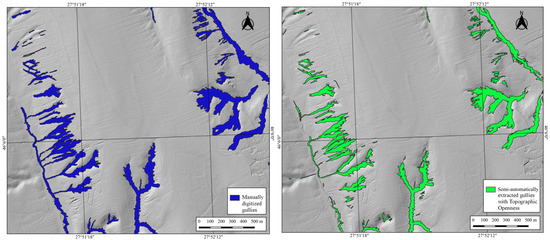 Gullies extracted using manual digitization (left), and semi-automatically extracted gullies using Topographic Openness (right).