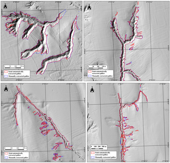 The four sample zones from the test area that were used for comparison between semi-automatically extracted gullies and manually extracted gullies (first area—upper left, the second area—upper right, the third area—bottom left, the fourth area—bottom right).