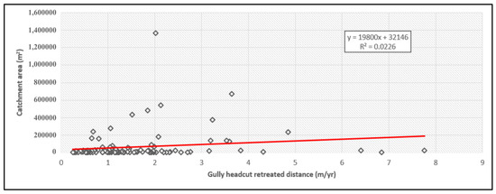 Plot of Catchment area to gully head-cut retreated distance per year.