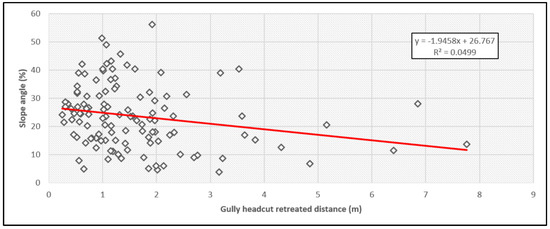 Plot of Slope angle values to gully head-cut retreated distance per year.
