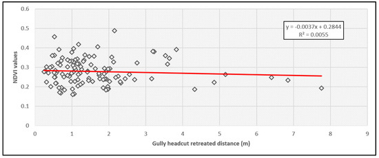 Plot of NDVI values to gully head-cut retreated distance per year.