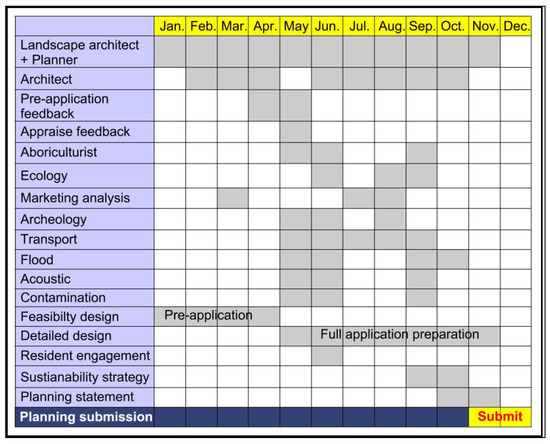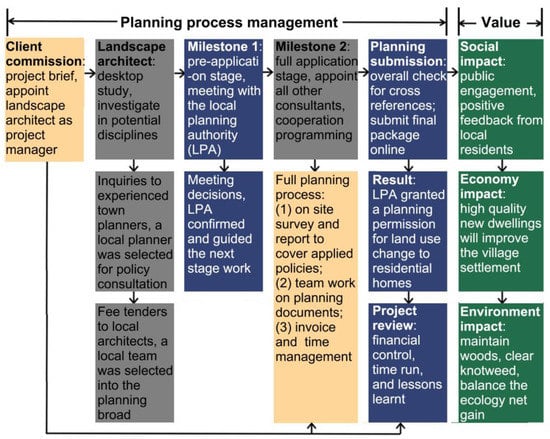 Planning permissions, which are consented to by Local Planning Authorities (LPAs) prior to most developments, for example, to build new dwellings, to make major changes to existing buildings, and to change the use of land, are legal requirements under the governance of the UK planning system. If any project needs planning permission but any work is conducted without getting it, an enforcement notice will be ordered for undoing all the changes [13,14]. Through official planning sources [15,16,17] as well as the result of most research [18,19,20], no case study of new housing planning in the Green Belts has been summarized into detailed research paper overarching teamwork and time goals of granting planning permission. The obvious gap between planning theoretical research and planning practice [21,22,23] results in the fact that the broader public has limited access to understanding the comprehensive work of proposing housing schemes to be permitted by LPAs within the Green Belts.