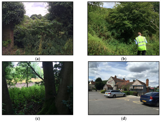 Site visits were carried out separately by the project manager with a landscape professional background, architect, topography surveyor, ecologist, arboriculturist, and other relevant team members. Using landscape site visits as an example (photo samples are shown in Figure 5), existing vegetation, landform, and water conditions had been recorded to form a working database. The situation of land boundaries had been checked: the east boundary of the site is defined by the A1184, London Road; the western edge is bounded by the railway line running between Bishops Stortford and Sawbridgeworth; to the north of the site are a large commercial vehicle showroom and a series of larger detached properties within wide plots; to the south of the site facing London Road is a line of semi-detached properties of medium size on long deep plots.