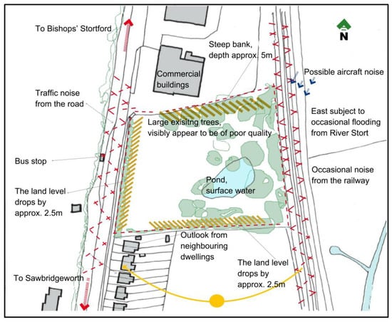 Site constraints from policy guidance to existing site conditions were summarized as follows: The site is located within the Metropolitan Green Belt. The site is within an area identified to be of Archaeological Significance. There may be palaeo-environmental deposits because of its proximity to Walbury Hill. The site is 2–3 m lower than the road level with steeply banked sides. The site is partially covered (about 50%) by an area of self-seeded trees and undergrowth. The trees have not been managed and so some are of poor quality. There is no existing vehicular access to the site. The site fronts a busy road—serving local traffic between Bishop Stortford and Sawbridgeworth and so consideration of the noise and air quality this generates must be considered. The site backs onto a railway line. The site to the east of the railway line is subject to flooding however, the railway line in this particular area is not generally affected by flood damage but consideration through sustainable measures should be applied to surface water flooding. There may be some contamination due to previous use within the site and from adjacent sites where commercial operations may have taken place that have leached contaminants. The site is to the north of a residential area and so care is to be taken to minimize any potential loss of privacy and outlook from these existing properties. To the north of the site are a number of commercial premises and so consideration is required to ensure these will not have an unacceptable impact on any proposed residential development in terms of noise, air quality, outlook, and privacy. The site is approximately 10 miles from Stanstead Airport and so subject to intermittent noise from overhead aircraft. During the day the road provides a direct link for local traffic between Sawbridgeworth and Bishops Stortford however the M11 lies parallel approximately 5 miles to the east and so London Road (A1184) has limited traffic. The railway on the eastern boundary connects Sawbridgeworth to Bishops Stortford and provides services from London to Stanstead Airport. The site is not within a planning flood risk zone however, the wood area to the east of the site is identified as an area that has a low risk of flooding for surface water. This area will not form part of the development but potential impact should be considered.