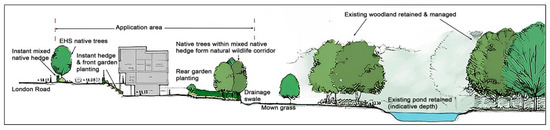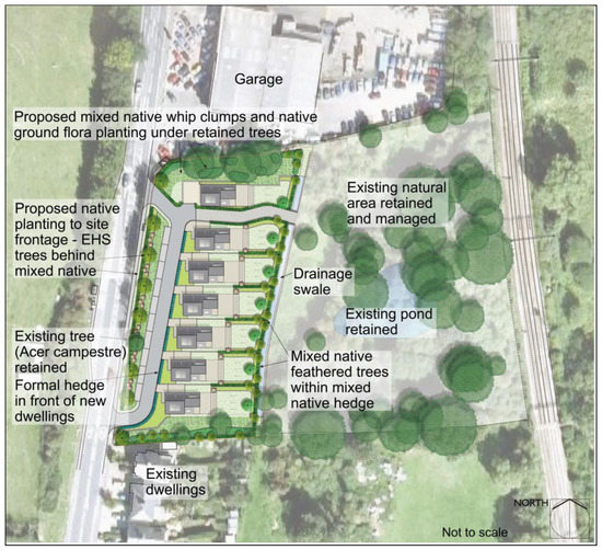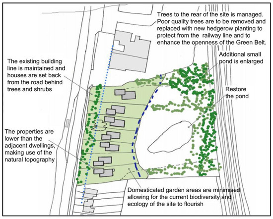 As shown in Figure 10, the seven residential dwellings which were carefully calculated in mass have been mitigated in a high-quality landscape proposal to ensure appropriate planting species to be used within the site and on the boundaries. Hard and soft materials across the site are counted in the existing ecology and landscape elements for providing treatment of the external envelope. Most on-site existing trees, woodland, and a pond on the east of the site were retained and to be managed (Figure 11). The landscape proposal remodeled the levels within the site, to allow the access road to be formed and create a mix of car parking spaces, terracing and gentle banks to the houses. Appendix A summarizes more detailed landscape information for the site.