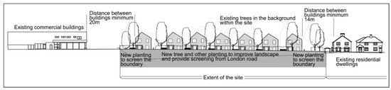 On the other hand, site opportunities were summarized as follows: There is an opportunity to provide a small-scale provision of needed good quality, medium-sized family houses with a sustainable vision. This would contribute to local facilities and support the future sustainability of Spellbrook. Development of the site is within the village envelope on an infill site between two ribbons of development. A modest discreet development would minimize any impact on the openness of the Green Belt. Spellbrook is a small village well served by facilities locally including a school, public house, and local businesses and so can benefit from small-scale development sustainably. There is an opportunity to provide enhancement to the ecology and biodiversity within the immediate and wider local area by managing the existing biodiversity on the site. The site is brownfield in that there were established buildings on the site in the mid 19C when the railway line providing access to and from London was extended as far as Spellbrook. The site is well-screened by trees from the road and also the site level changes that fall by approximately 2.5 m would ensure that a discreet development of residential housing would not impact the visual appearance of the site from the road (Figure 7). Some development of the site would provide the opportunity for improvements to the public realm and streetscape of London Road. The site has good accessibility with a regular bus route between Bishops Stortford and Sawbridgeworth passing by the site and a bus stop on the opposite side of the road. Wider links by car to Sawbridgeworth and Bishops Stortford stations provide regular links to London and the east of the country and beyond via the M11 and M25 both approximately 5 miles away. In addition, the site is conveniently located at Stanstead Airport. The limited residential properties immediately adjacent to the site development would not impact the amenity and privacy of others. The commercial uses to the north are principally vehicular driven, car showroom, car wash, and access platform hire, so there is a limited environmental impact from these premises that would be unacceptable to adjacent occupants. As well, the site is approximately 5 m lower than these premises so there is no perception of intrusion.
