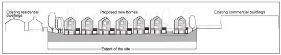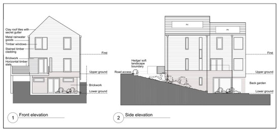 A series of studies were carried out within the context of London Road to assess the impact of the form. The width of individual buildings has been restrained to ensure the appearance of the development does not harm or have an impact on the openness of the Metropolitan green belt, see Figure 12, Figure 13 and Figure 14. The proposed accessway was set out as a shared surface using permeable paving and SUDS principles. An additional access route within the site was designed to allow maintenance of the rear site. The impact of garages was minimized by reducing their built form. The seven dwellings were three-to-four-bedroom houses each approximately 140 m2 set over three split levels: Lower ground, upper ground, and first floor. The dwellings were designed to meet DCLG Technical Housing standards in terms of floor area and spatial quality and to be highly energy efficient exceeding building regulation requirements through a Fabric-First approach to energy use, and making use of sustainable measures such as site topography, solar gain, water attenuation and photo voltaic panels on the south facing roof. The contemporary appearance of the houses was using traditional materials of timber clapboard and brickwork using local buildings for reference.