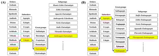 Figure 3 shows the soil classification for two paddy soils based on the ST system. According to the soil orders as the highest level of the soil classification system, pedon 1 was classified as Inceptisols based on the cambic horizon (Figure 3A), a subsurface layer of pedogenic change without visible illuviated materials, and seasonal high-water table within 100 cm depth [20,21]. Inceptisols consist of six suborders categorized depending on the temperature and moisture regimes: Aquepts (aquic; a water table at or near the surface for many years), Gelepts (gelic; very cold climates), Cryepts (cryic; cold climates), Ustepts (ustic; semiarid and subhumid climates), Xerepts (xeric; very dry summers and moist winters), and Udepts (udic; humid climates). Given the well-draining characteristic of pedon 1, it was classified as Udepts. Next, the great group of Udepts was categorized as Sulfudepts (sulfuric; highly acid horizon within 50 cm), Durudepts (duripan; silica-cemented layer within 100 cm), Fragiudepts (fragifan; firm and brittle not cemented layer within 100 cm), Humudepts (umbric or mollic epipedon; rich in humus with low or moderate base saturation, respectively), Eutrudepts (base saturation of more than 60% in >75 cm), and Dystrudepts (base saturation of less than 60% in >75 cm) [21]. Based on this, pedon 1 belonged to Eutrudepts. Subsequently, according to the soil subgroup of Eutrudepts [8] that includes Humic Lithic (a value of less than 3 and containing stone material within 50 cm), Lithic (stone material), Aquertic (aquic conditions), Vertic (a slickenside or wedge structure), Andic (andic properties; volcanically produced material), Vitrandic (containing volcanic glass), and Anthroaquic (artificially irrigated), pedon 1 belonged to the Anthroaquic category. In a report by Han (2018) [22], several paddy soils with long-term irrigation practices in Korea were classified as Anthroaquic Eutrudepts. Since the soil temperature regime of pedon 1 was mesic and the soil texture was coarse loamy, taking these together, the final taxonomic name according to the ST system was a coarse loamy, mesic family of Anthroaquic Eutrudepts (Figure 3A).