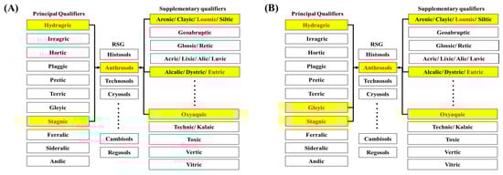 Soil classification was performed according to the criteria of the ST and WRB systems, using data on the field survey and physicochemical properties. The ST is a hierarchical taxonomy with six categorical levels as follows: order, suborder, great group, subgroup, family, and series [8]. There are a total of 12 orders, with the top hierarchical level that further applies the soil properties, including depth, moisture, temperature, texture, structure, OM content, cation exchange capacity, salt content, base saturation, and clay mineralogy [8]. Table 3 shows the detailed information on 12 orders in ST. On the other hand, the WRB classification system is performed in the order of the diagnostic horizon, diagnostic properties and diagnostic materials, and the field measurement and observation of soil characteristics considering the soil formation process are required. This classification system is categorized into two levels: reference soil groups (RSGs) and soil units [9]. In the first level, there are 32 RSGs that are categorized by reflecting similar pedogenesis, parent material formation, or major ecological regions (Table 4). An RSG is selected as a major characteristic for the generation and development of soil. Afterwards, in the second level, 185 qualifiers are selected based on the properties of soil physics, chemistry, biology, and mineralogy, which are defined and divided into two groups, i.e., principal and supplementary qualifiers. For naming the soil, a set of qualifiers was combined with RSG; the principal qualifiers are listed from right to left in order of importance before the RSG, and the supplementary qualifiers are listed alphabetically in parentheses after the RSG. The WRB soil classification system [9], which was a newly revised fourth edition at the World Congress of Soil Science 2022 in Glasgow, was used in this study. The principal qualifiers represent the main characteristics that determine the RSG, so they are major factors in evaluating soil formation and development process. In the revised WRB [9], changes in the classification wording criteria, such as the movement of ‘gleyic’ and ‘stagnic’ related to soil water saturation from supplementary to principal qualifiers, was applied to the present study.