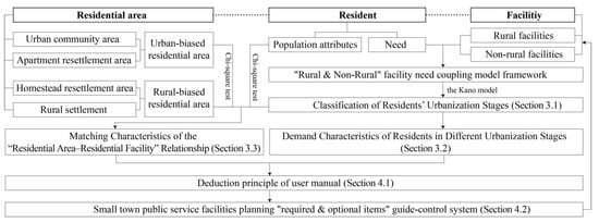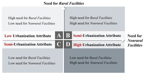 Construction of the Model Framework for Residents’ Urbanization Characteristics: After classifying the residents based on their levels of recognition of the types of facility, a “rural and nonrural” facility need coupling model framework was constructed to reflect the differentiation of residents’ urbanization stages (Figure 1).