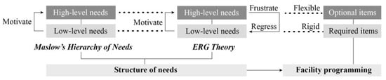 “Need” is the internal force that drives individuals to seek and utilize specific objects [33]. It represents the pre-motivational factor driving human behavior [34] and is the key driver of facility usage. Considering the restrictions imposed by policies and funding in villages and towns [35], the establishment of facilities cannot be achieved overnight. Therefore, prioritization based on the urgency of a need is necessary [36,37,38]. In terms of the hierarchy of needs, American psychologist Abraham Maslow proposed a theory encompassing physiological, safety, social, esteem, and self-actualization needs [39]. Maslow believed that lower-level needs must be adequately met before higher-level needs can be satisfied [40] and that this process is irreversible [41]. Clayton P. Alderfer, an American psychologist, developed the Existence–Relatedness–Growth (ERG) Theory, building upon Maslow’s Hierarchy of Needs [42]. Both theories suggest that once lower-level needs are met, there is a desire for higher-level needs. However, the ERG Theory expands upon this idea by proposing that different levels of needs can coexist [43,44] and multiple needs can simultaneously act as motivators. Moreover, the ERG Theory incorporates the idea of “frustration-regression”, which suggests that when higher-level needs are not met, individuals may regress to lower-level needs [45,46]. In the allocation of public service facilities, not all high-level needs can be met. Therefore, low-level needs should be controlled through “rigid” measures, while high-level needs should be guided through “flexible” measures. A “required + optional item” programming model should be adopted to respond to the structural characteristics of residents’ public service facility needs (Figure 2). Hence, facility implementation should prioritize satisfying the mandatory requirements (low-level needs) before the optional requirements (high-level needs). To identify the overall need hierarchy of residents with different urbanization levels in each analyzed residential area, an individual need structure is identified. Then, based on certain principles, this study integrates the needs of the residents and, subsequently, obtains a programming guidance-control system for different residential areas.